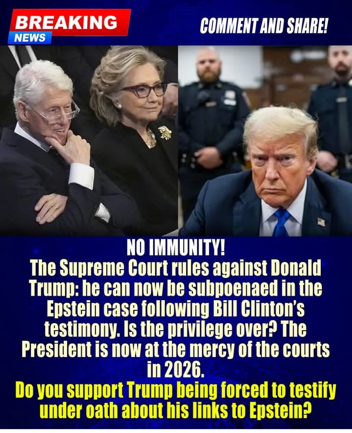 BREAKING: In a decision that has paralyzed Washington, the U.S. Supreme Court has ruled that Donald Trump does not enjoy absolute immunity in the Jeffrey Epstein case. This resolution clears the way for the President to be formally subpoenaed, marking a historic precedent in 2026.